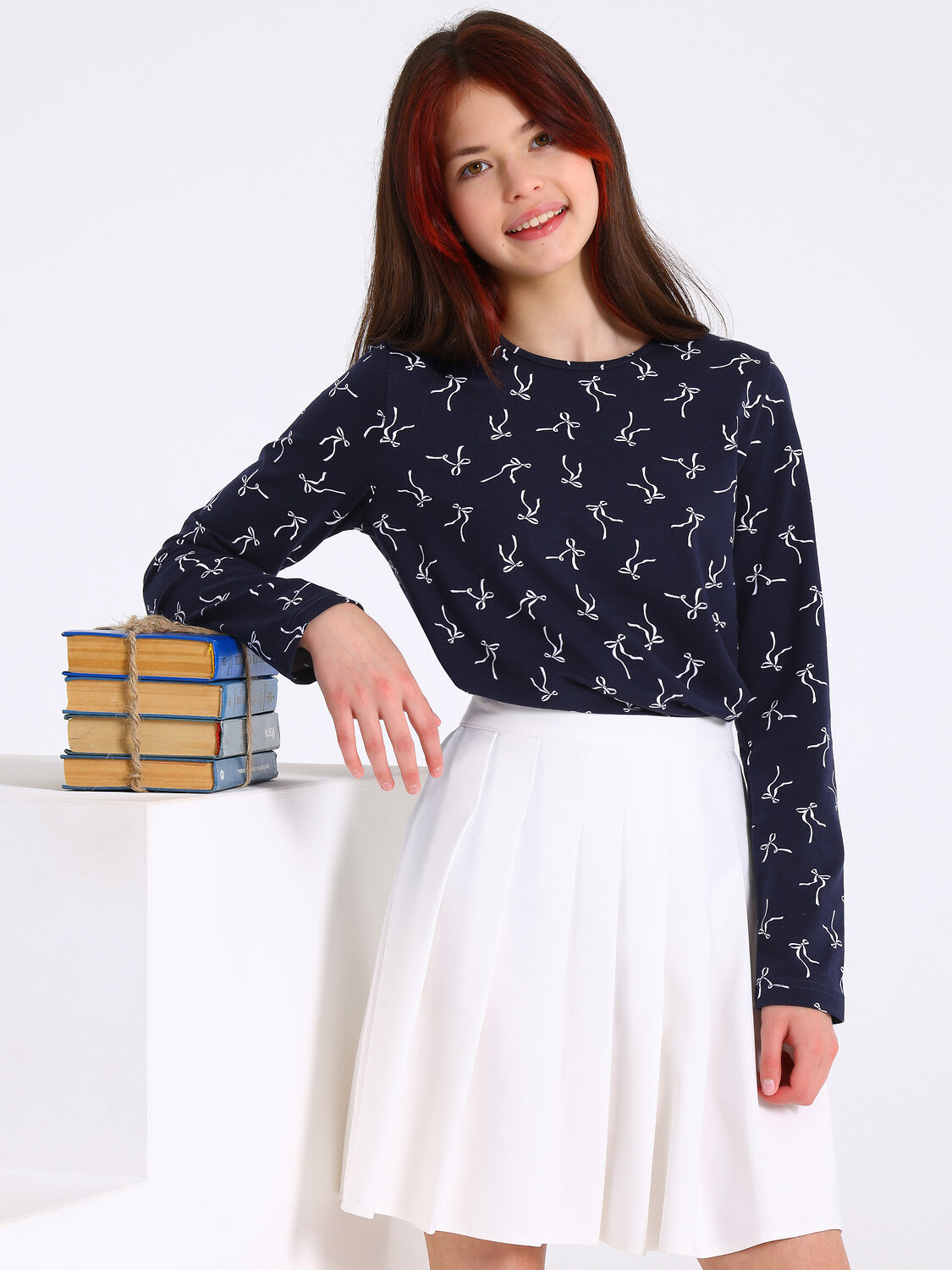 Девочкам. белые бантики на темно-синем/152 (635 руб.), белые бантики на темно-синем/158 (635 руб.), белые бантики на темно-синем/164 (635 руб.).