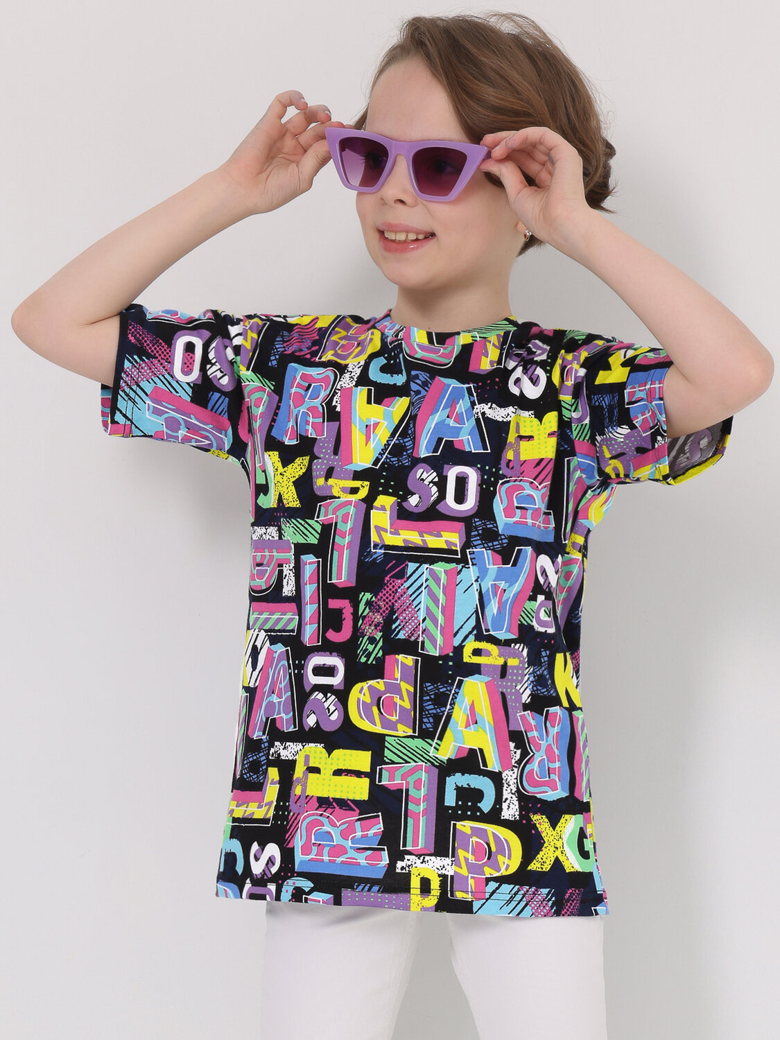 Девочкам. цветные буквы на черном/128 (450 руб.), цветные буквы на черном/134 (450 руб.), цветные буквы на черном/140 (450 руб.), цветные буквы на черном/146 (450 руб.)