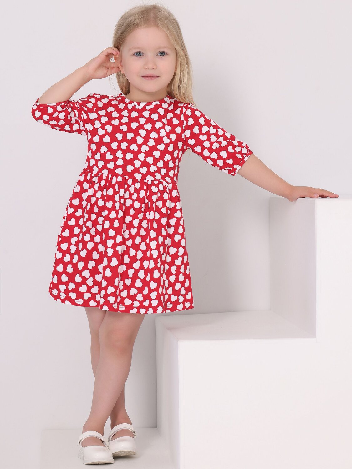 Девочкам. белые сердечки на красном/98 (640 руб.), белые сердечки на красном/104 (640 руб.), белые сердечки на красном/110 (640 руб.)