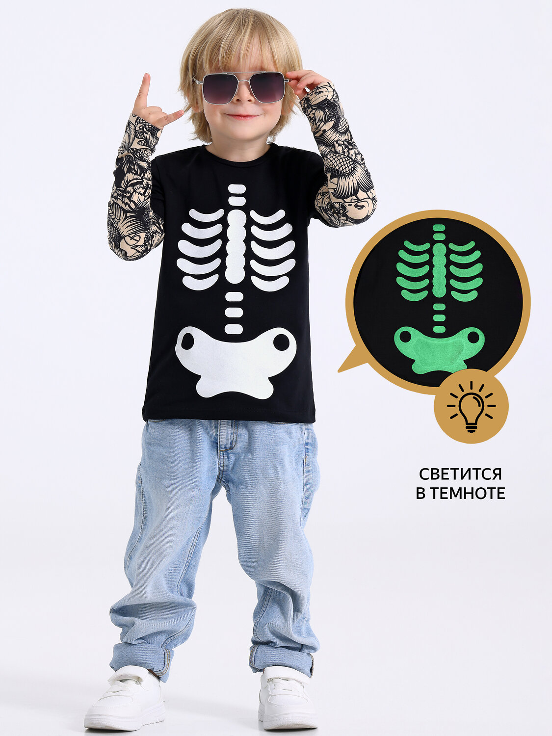 Мальчикам. черный+карпы тату / Скелет свет/98 (535 руб.), черный+карпы тату / Скелет свет/104 (535 руб.)