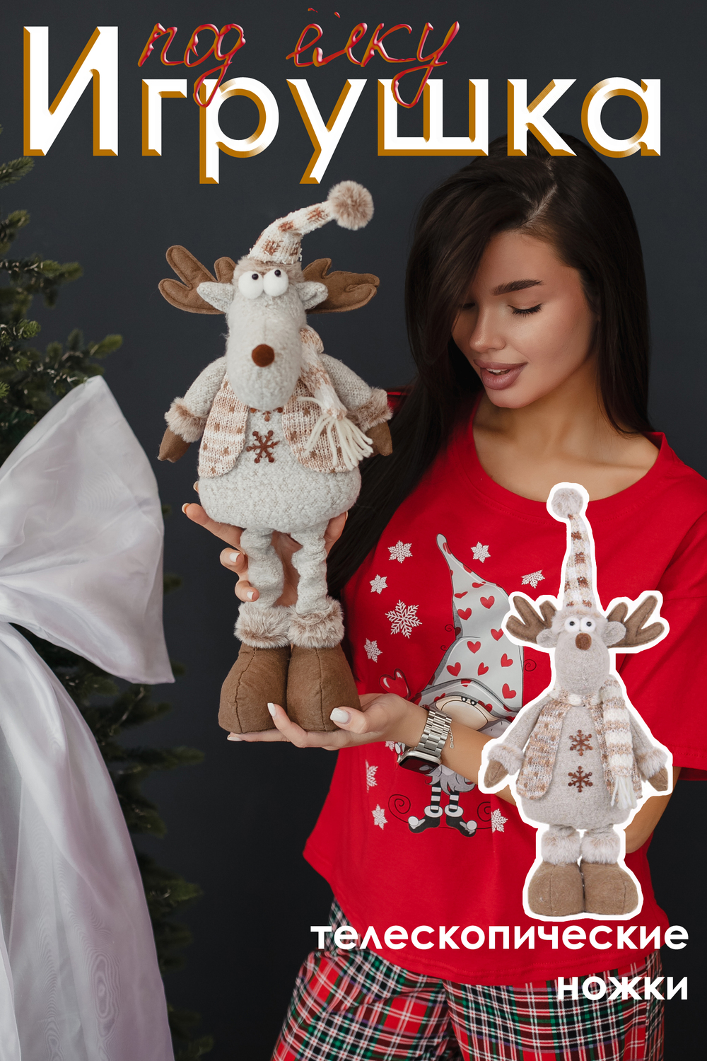 Натали. Игрушка новогодняя с выдвижными ногами Олень колпак бежевый.