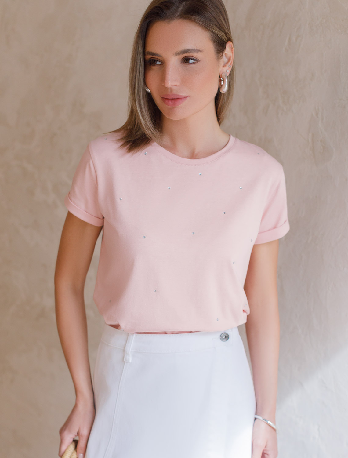 Vilatte. Футболка из эластичного хлопка с принтом стразы D49.097 пудра_стразы.