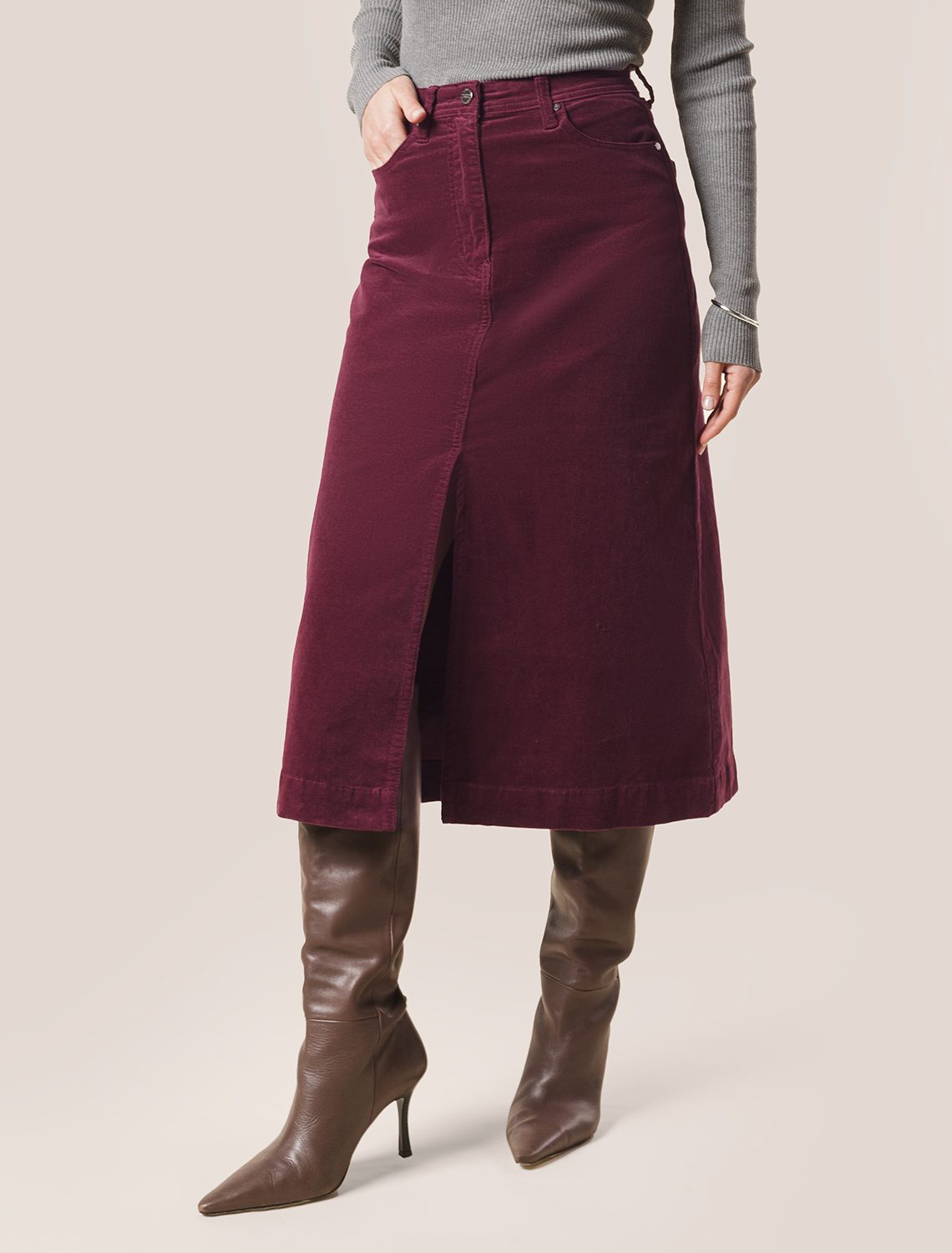 Vilatte. Юбка А-силуэта из эластичного микро-вельвета D26.192 бургунди.