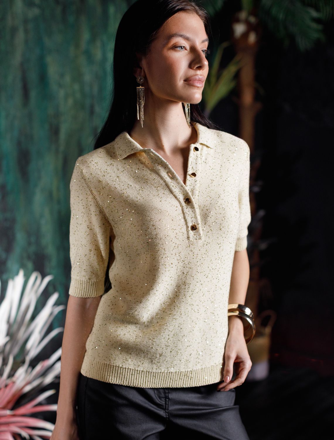 Vilatte. Джемпер поло с застежкой на пуговицы из хлопковой пряжи с пайетками D39.365 бежевый.