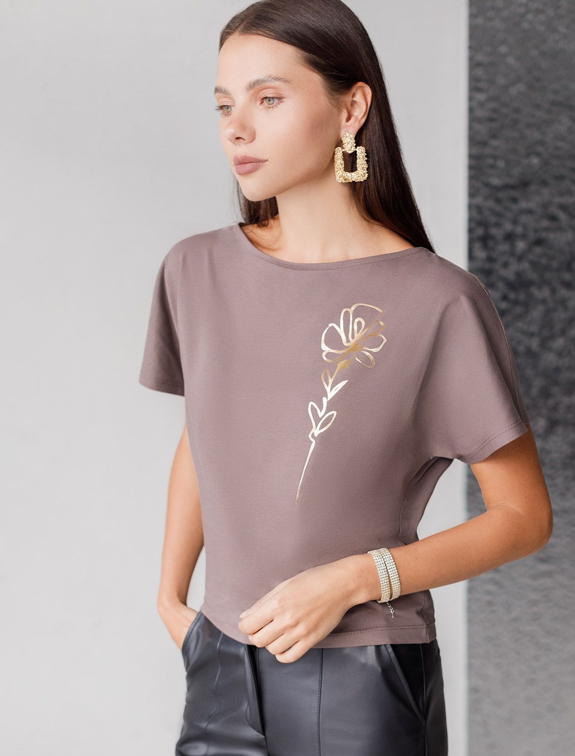 Vilatte. Нарядная футболка с блестящим принтом D49.133 кофейный_цветок.