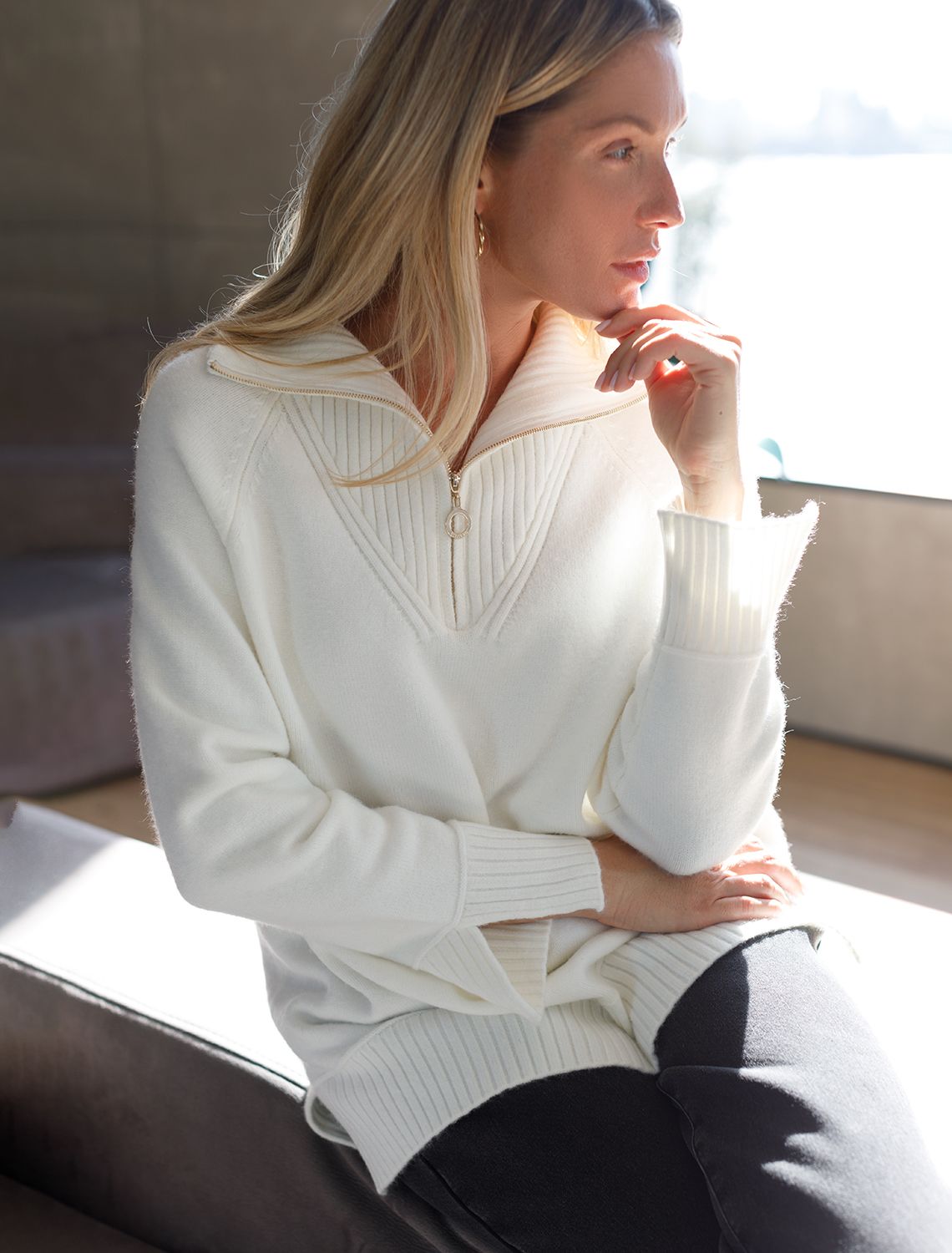 Vilatte. Джемпер с воротом на молнии из пряжи с кашемиром D34.132 натуральный белый.