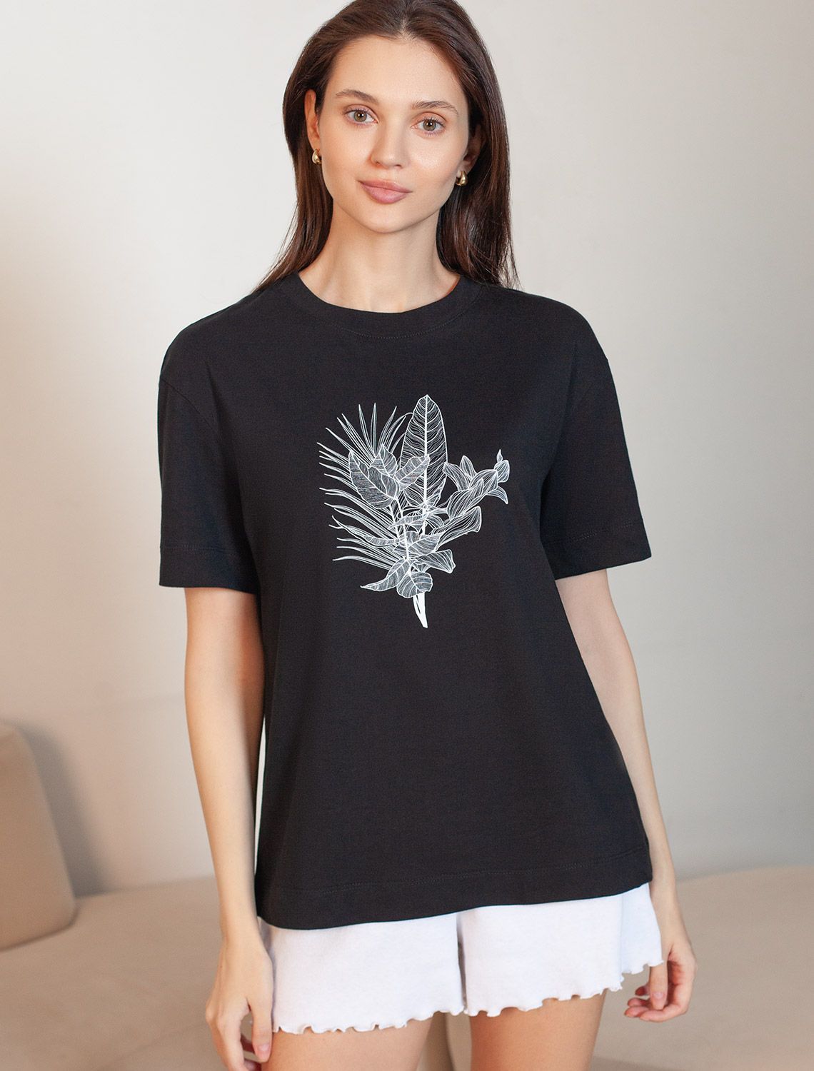 Vilatte. Футболка с принтом свободная из премиального 100% хлопка D49.158 черный_тропики.
