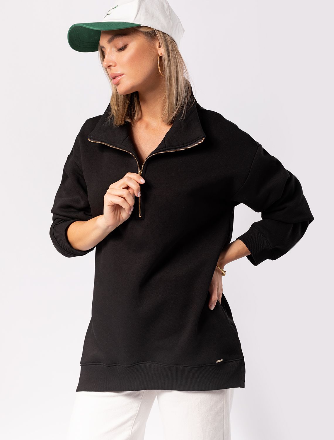 Vilatte. Джемпер с воротником стойкой на молнии из футера-трехнитки D49.964 черный.