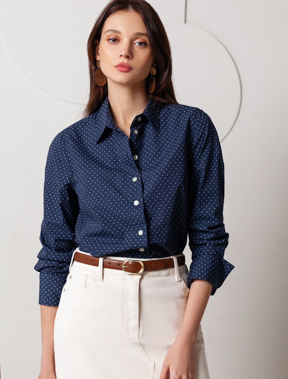 Vilatte. Блузка свободного силуэта в мелкий горошек из эластичного хлопка D29.300 темно-синий.