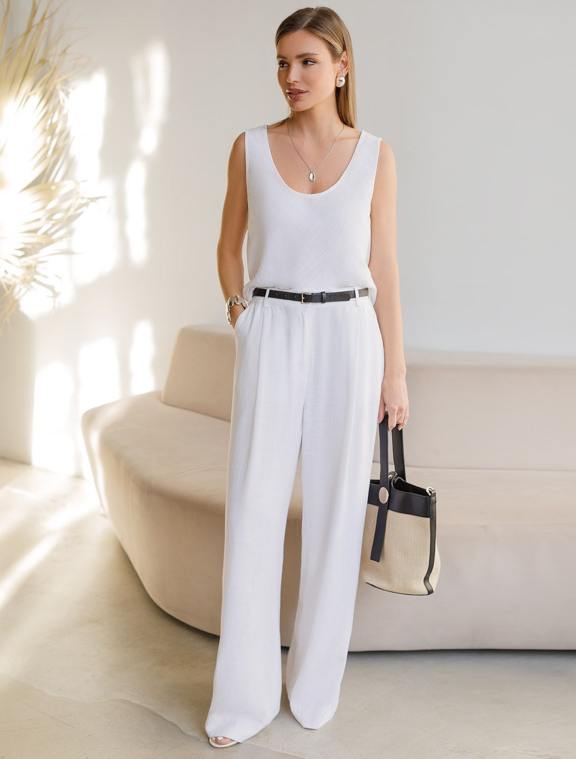 Vilatte. Свободные брюки палаццо на эластичном поясе изо льна с вискозой D24.308 белый.
