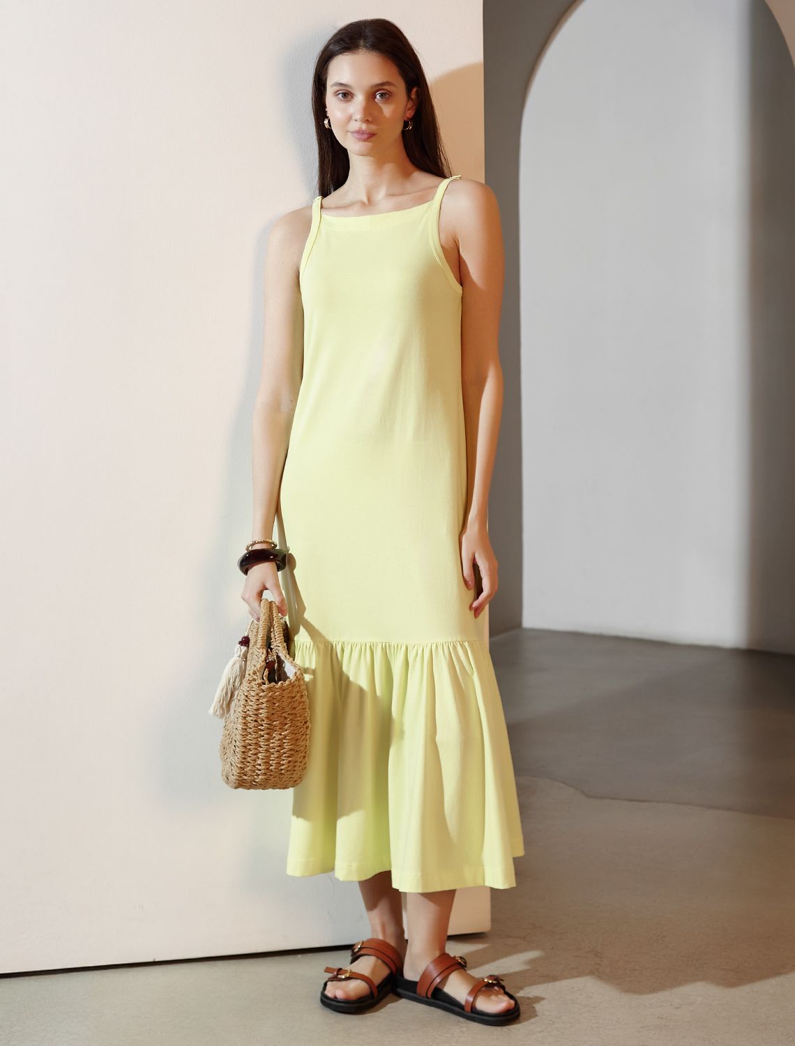 Vilatte. Летнее платье миди из гладкого эластичного хлопка D42.126 лимонный.