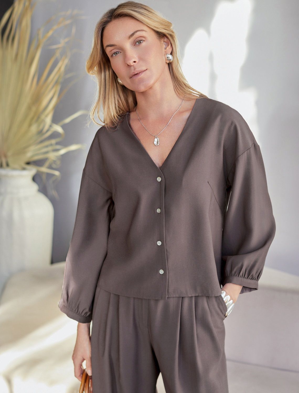 Vilatte. Укороченная блузка с V вырезом из плотного лиоцелла D29.356 кофейный.