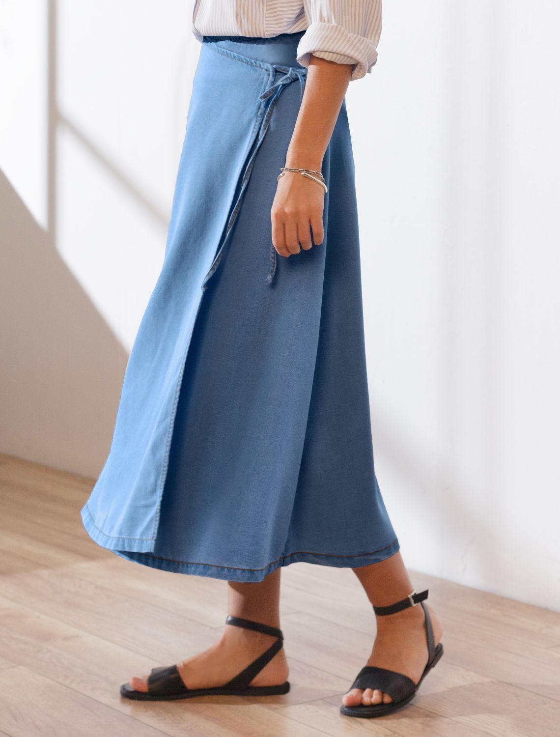 Vilatte. Юбка миди на запах А-силуэта из джинсового лиоцелла D56.127 светло-синий.
